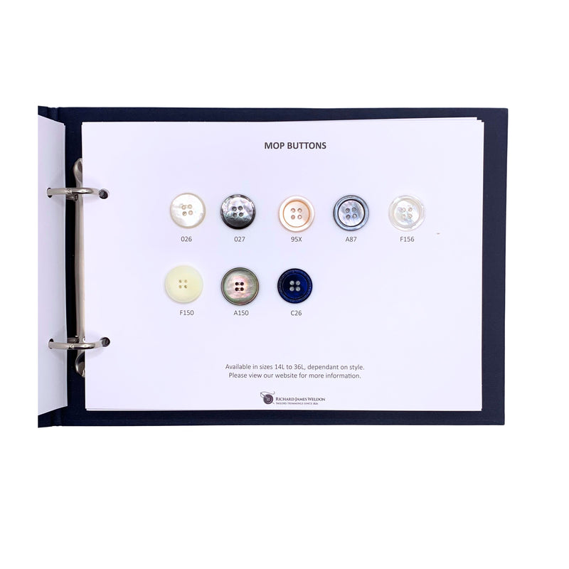 Button and trim samples are displayed on A5 cards, available individually or as complete collections.